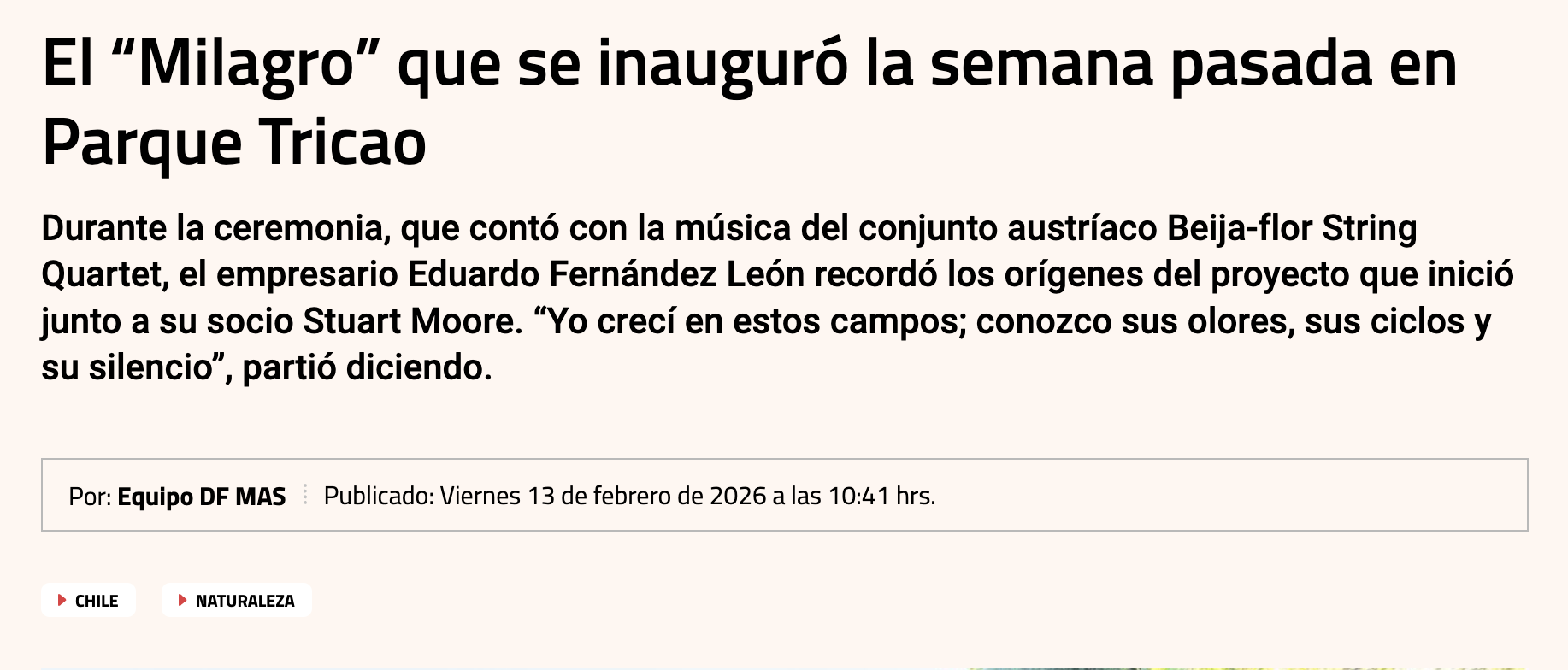 13 Feb El “Milagro” que se inauguró la semana pasada en “Parque Tricao” | DF, Diario Financiero Noticias 13/02/2026 Por: Diario Financiero