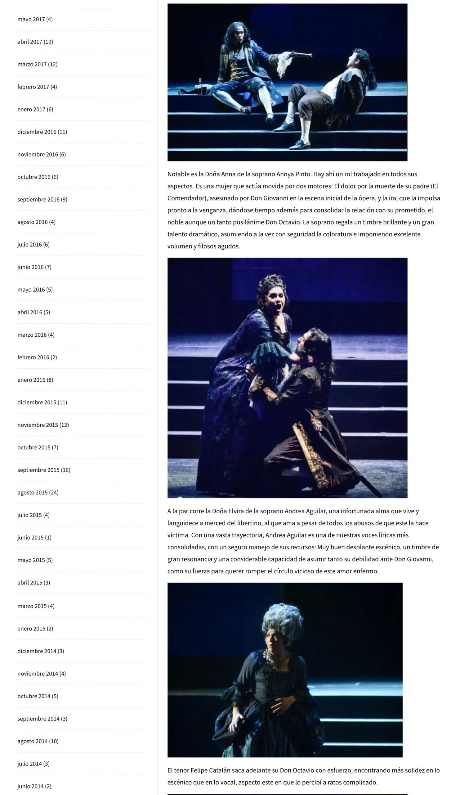 “Me sorprendió gratamente el Leporello del bajo-barítono Arturo Espinosa, imbuido a fondo en este personaje que, por momentos, resulta una proyección de su amo, se las ingenia para obedecer al libertino, tomándose cuando puede atribuciones que también lo perfilan como un ser abusivo y misógino. Espinosa luce una voz potente y muy bien colocada, maneja su material con soltura y se planta con mucha seguridad en cada escena. Se trata de un trabajo destacable en todo aspecto y que habla de un joven intérprete en pleno dominio de sus recursos y capacidad artística.”